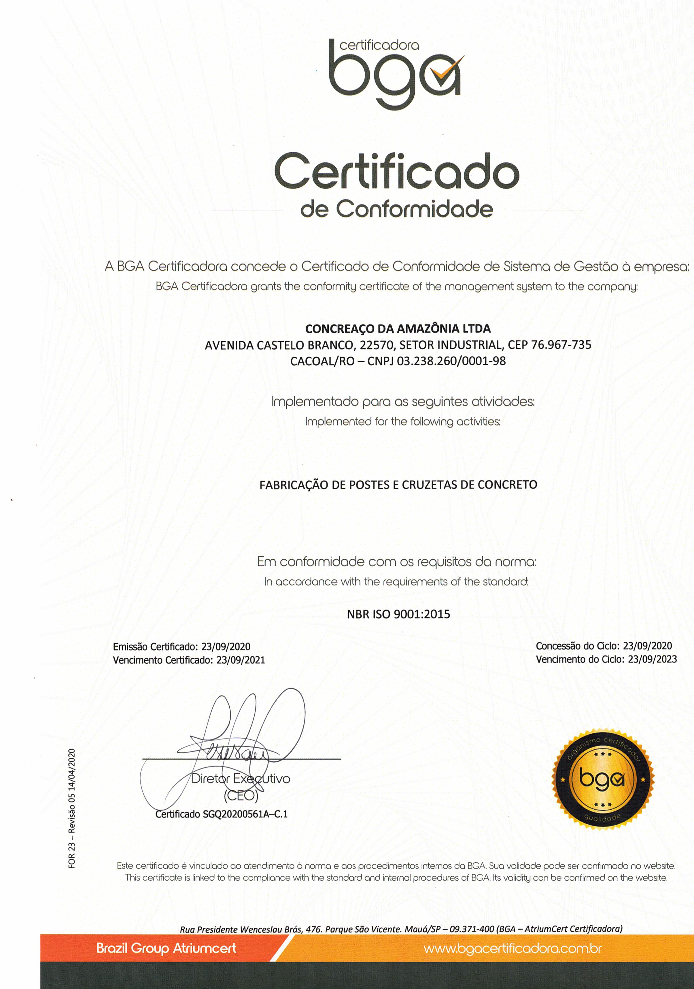 ISO 9001 é uma norma de padronização para um determinado serviço ou produto, e sua maior Importância é melhorar a gestão de uma empresa e padronização do produto. A Concreaço está sempre buscando a otimização de processos, maior agilidade no desenvolvimento de produtos e produção mais ágil de modo a satisfazer os clientes e alcançar o sucesso sustentado.