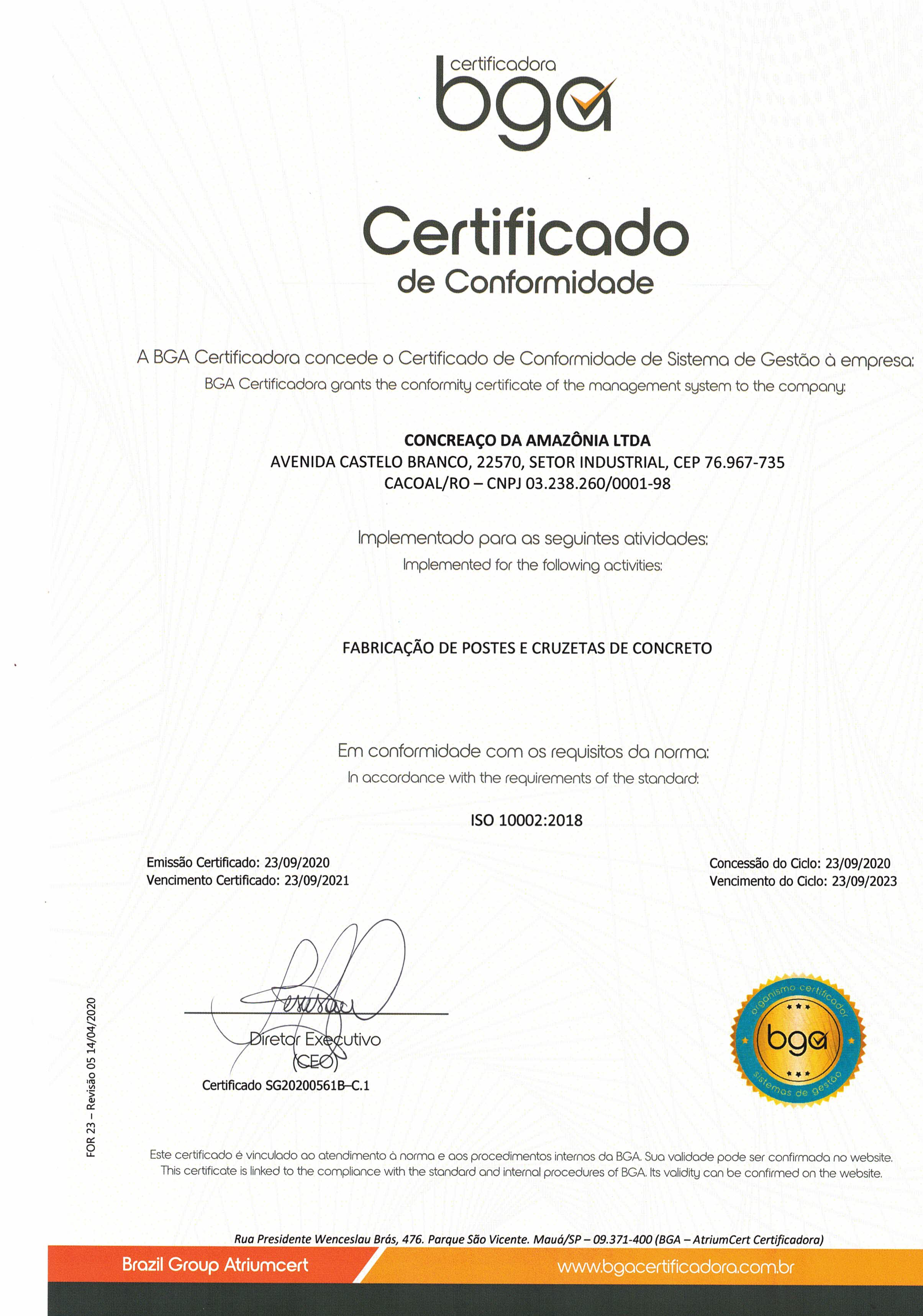 A Concreaço da Amazônia está sempre pensando em seus clientes, e está implantando a ISO 10002, norma que estabelece requisitos para a criação e implementação de processos de tratamento das reclamações dos clientes, relacionadas com produtos/serviços, incluindo planejamento, concessão, operação, manutenção e melhoria, tendo como objetivo a satisfação do cliente.